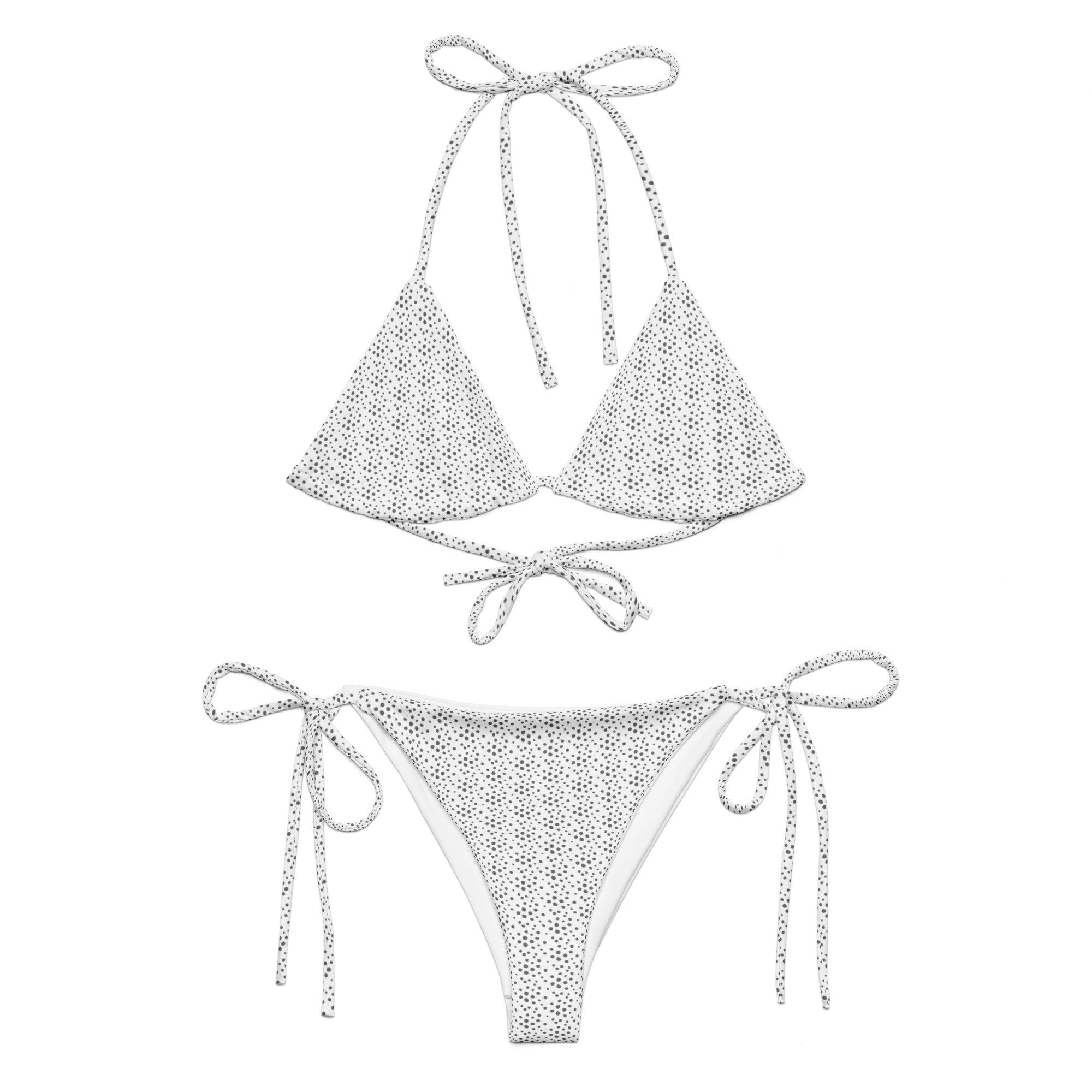 Introducing our Black Dots Pattern all over print Recycled String Bikini, a perfect blend of style and sustainability. This bikini set is crafted from a blend of 81% recycled polyester and 19% Lycra spandex sourced from Mexico, offering a soft and stretchy material that provides UPF 50+ protection.