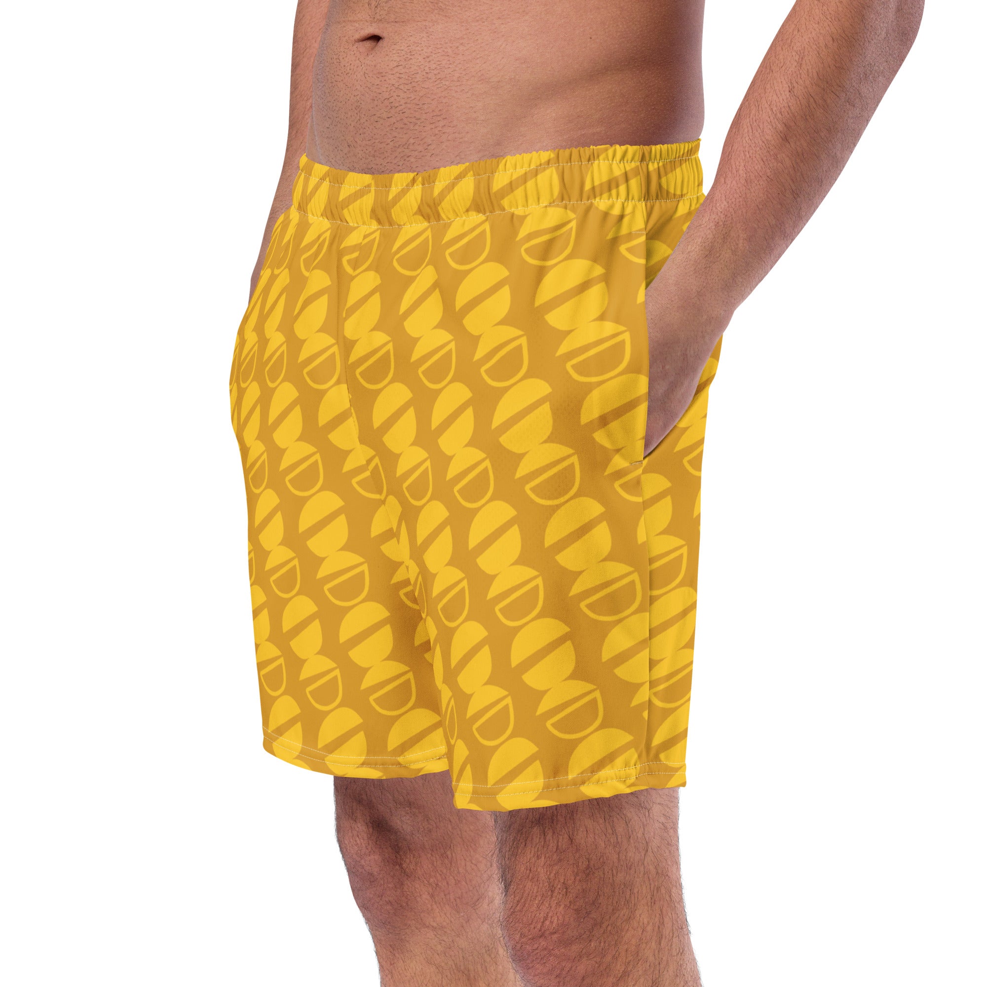Keep your essentials safe with our mesh pockets and a small inside pocket for your valuables. Enjoy the sun safely with UPF 50+ protection. Our fabric is OEKO-TEX 100 standard certified and Global Recycled Standard (GRS) certified, ensuring sustainability and quick drying with minimal skin irritation. Experience the perfect blend of comfort, style, and sustainability with our Buttercup Half Circle Pattern Men’s Recycled Swim Trunks."
