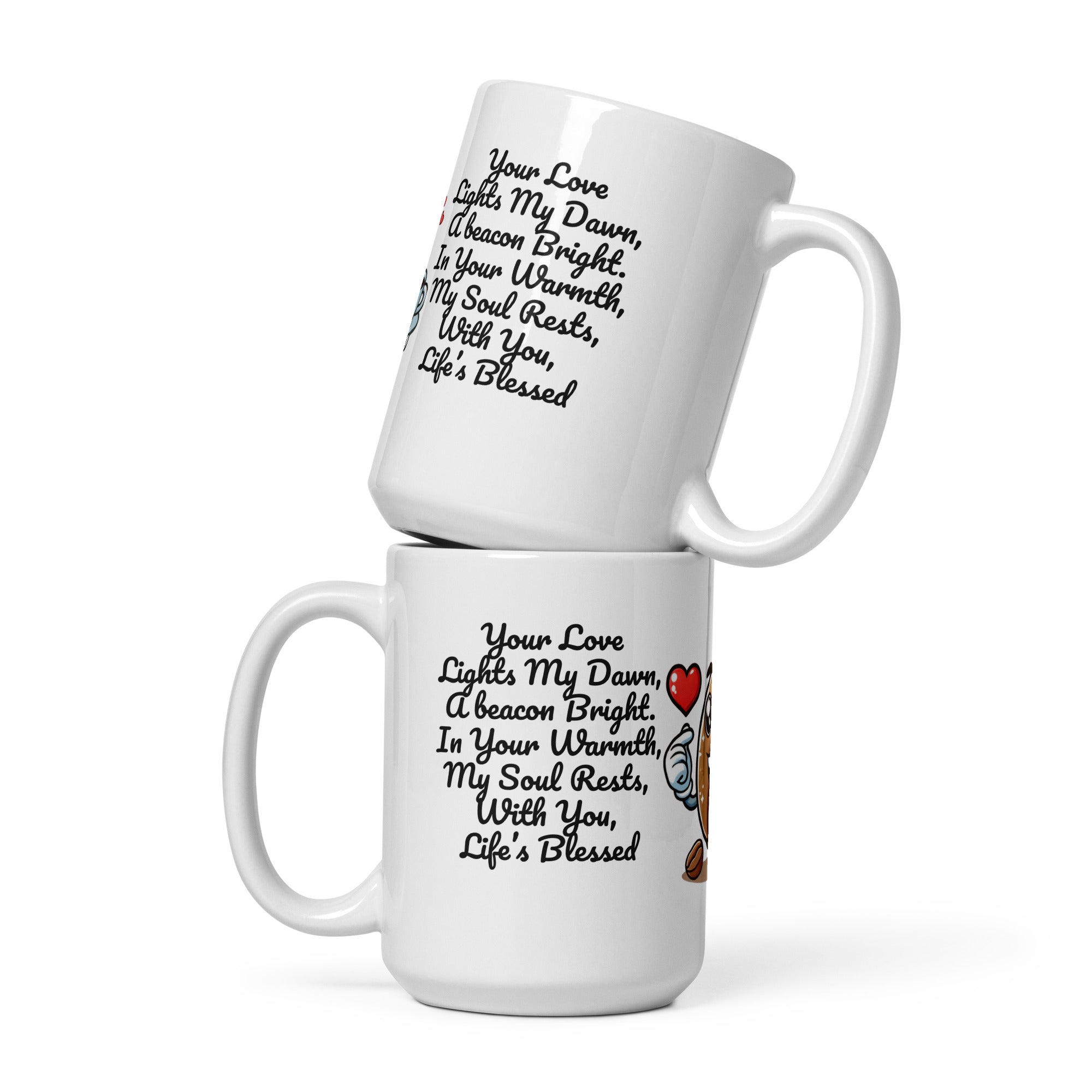 Available in two sizes – 11 oz and 15 oz – you can choose the perfect fit for your caffeine cravings. The beautifully crafted slogan, "Your love lights my dawn, A beacon bright. In your warmth, my soul rests, With you, life’s blessed," will add a splash of love to your mornings, or any time of the day.