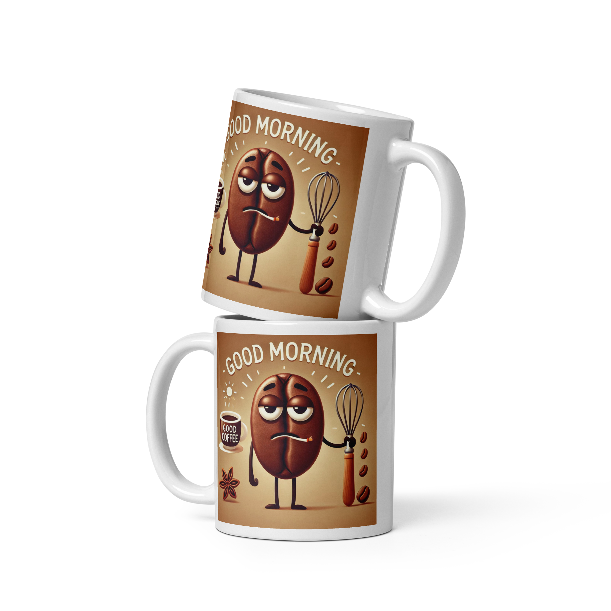 Start your day with a chuckle and a strong brew. This ceramic mug features a hilariously tired coffee bean clutching a whisk, surrounded by steaming cups and cozy coffee graphics. With bold “GOOD MORNING” lettering and warm beige tones, it’s the perfect mug for anyone who needs caffeine before conversation.