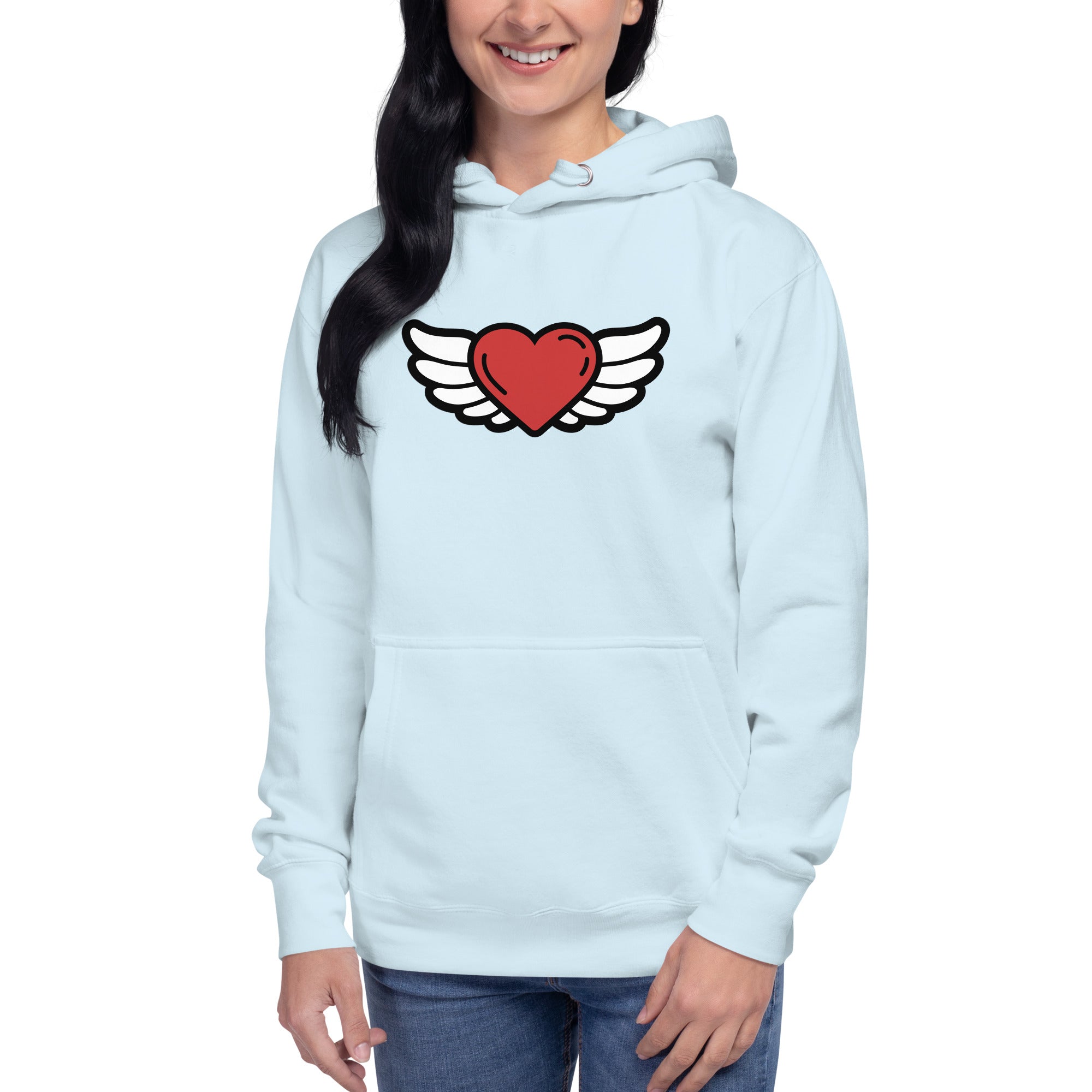 The hoodie features matching flat drawstrings and a 3-panel hood for a perfect fit. Each hoodie comes with a tear-away tag for maximum comfort. What sets this hoodie apart is the unique graphic of a heart angel, adding a sweet and heavenly touch to your attire.
