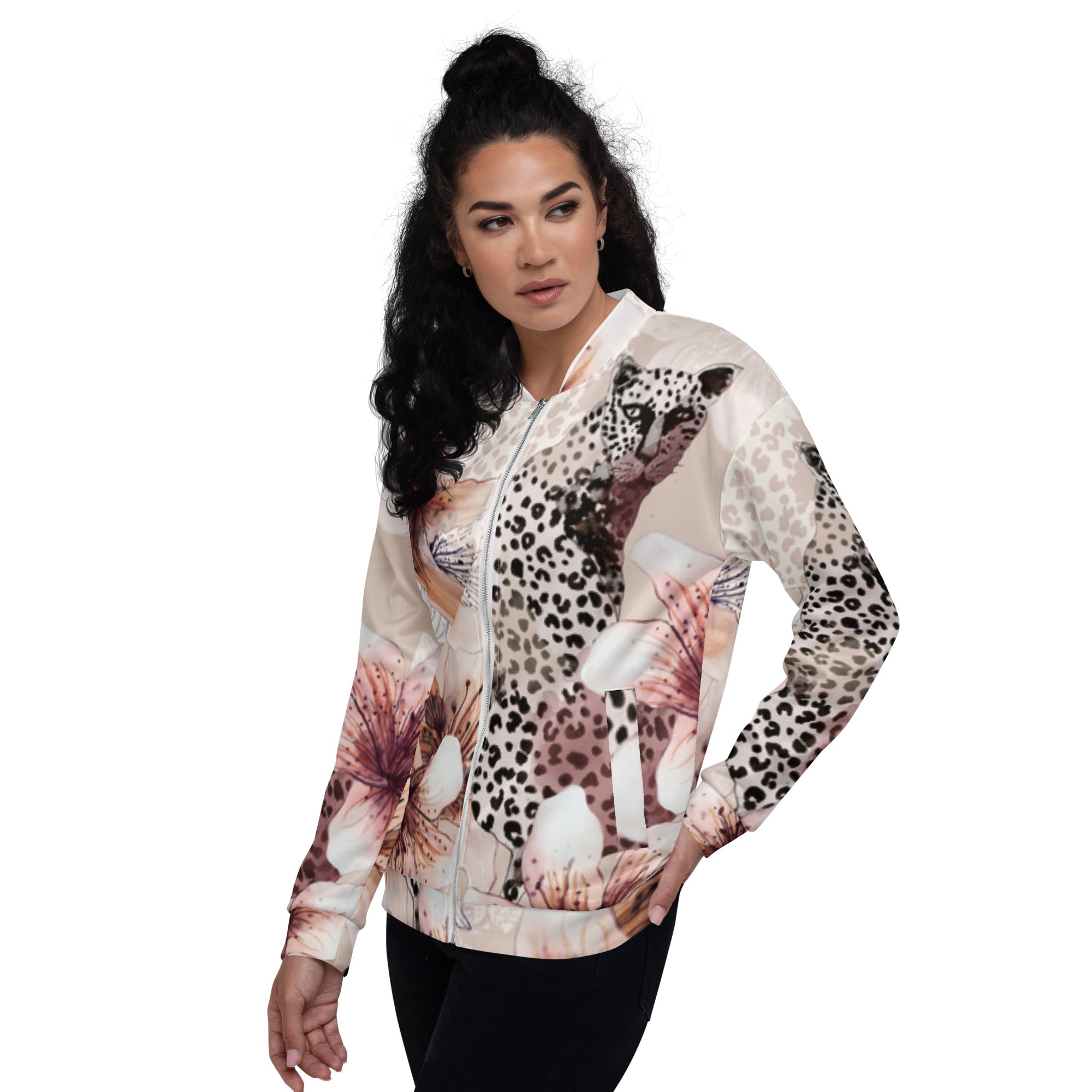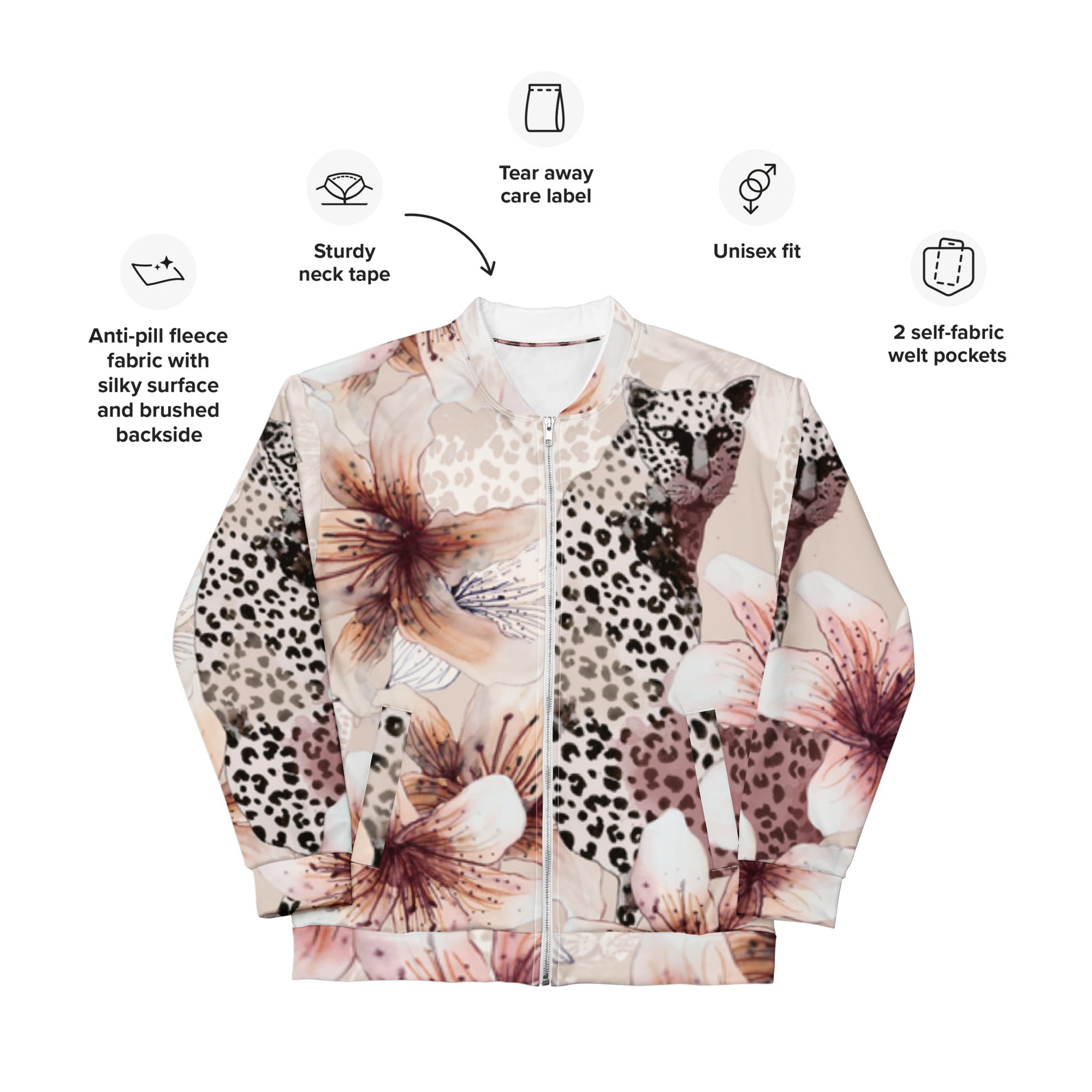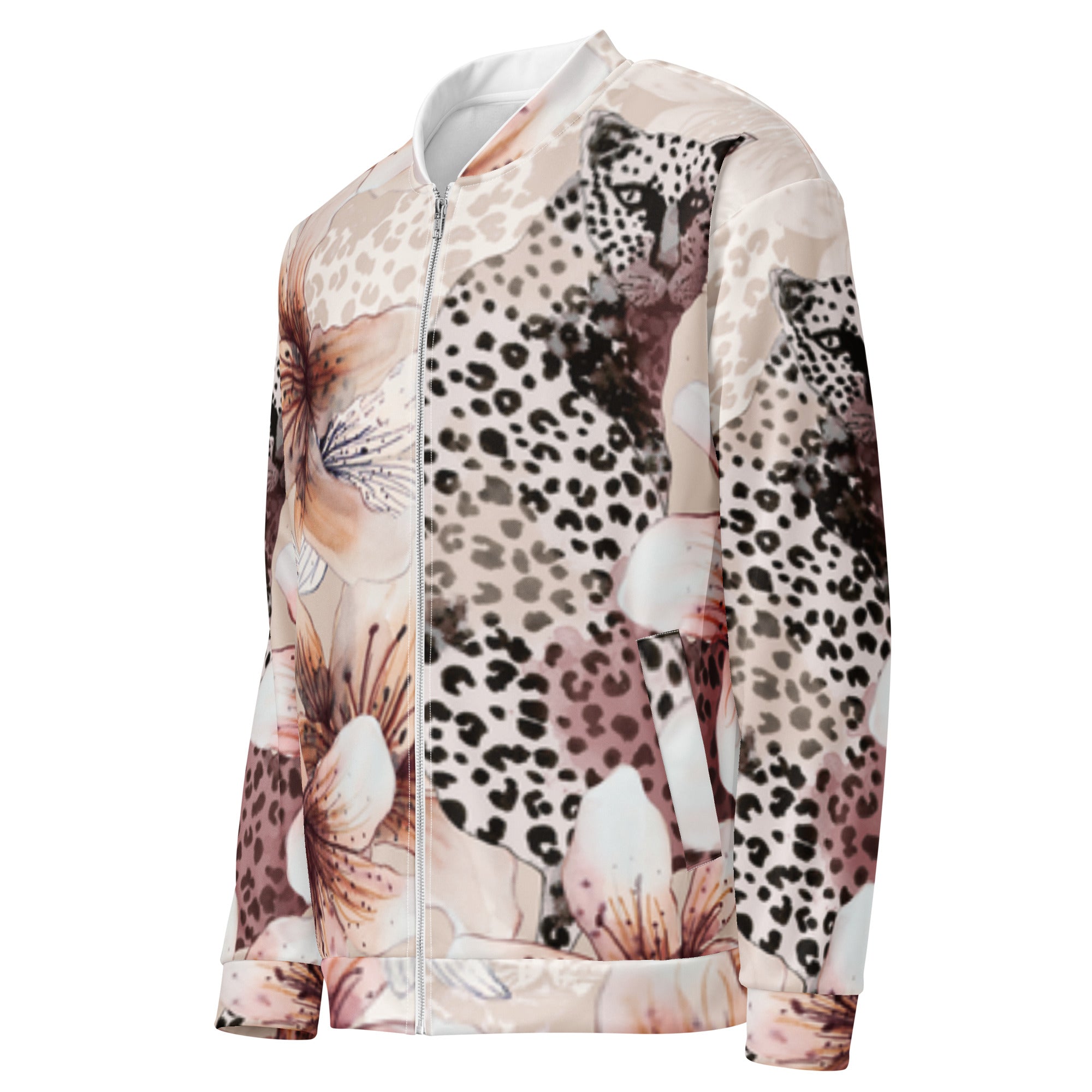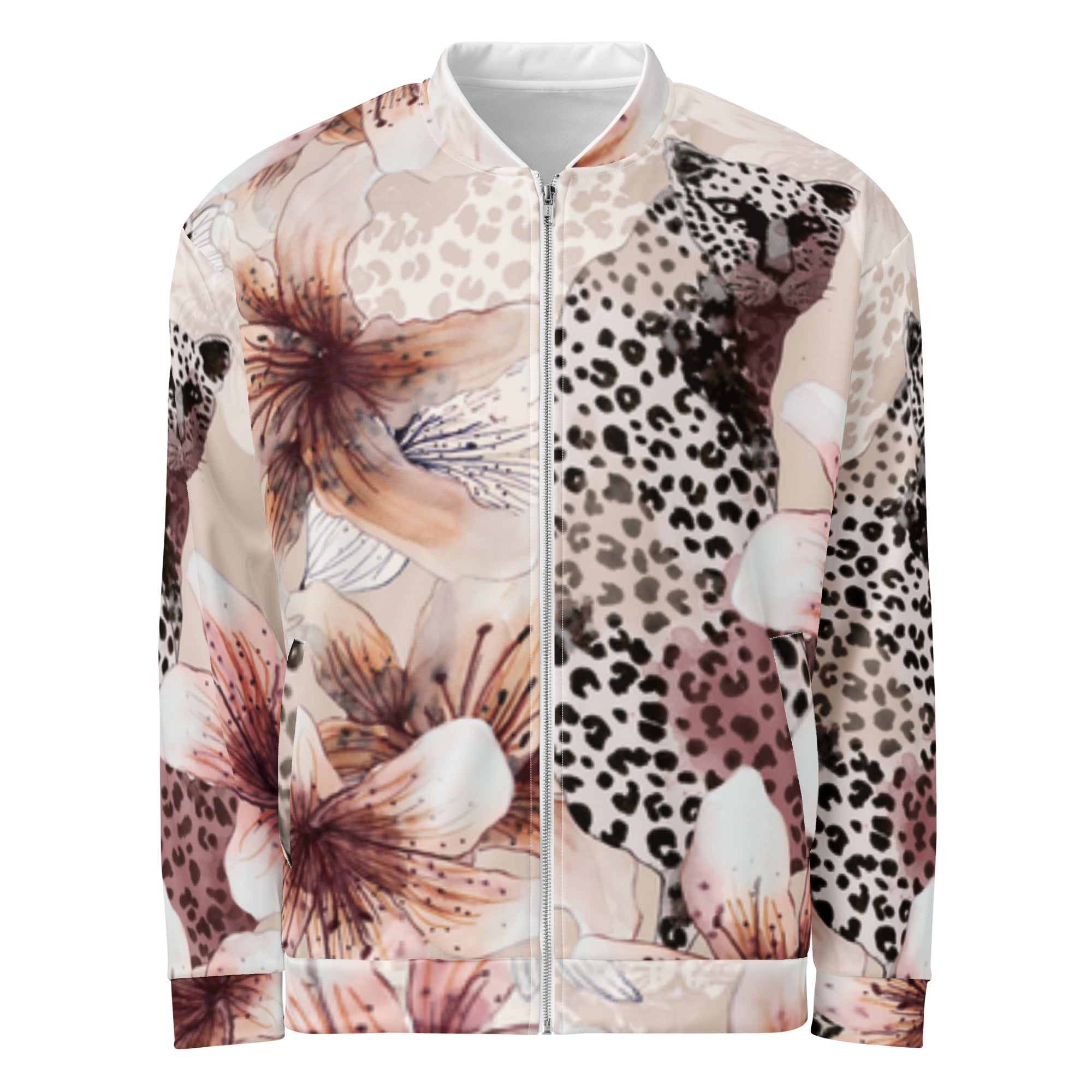 Turn heads with this fierce-meets-floral masterpiece. Featuring expressive leopards and soft watercolor lilies, this jacket blends wild energy with botanical elegance—crafted for comfort, built to stun.