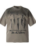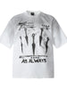 Make a statement with this basic-fit graphic tee, featuring a striking vertical arrangement of five kunai-style knives and layered text elements that evoke underground grit and cryptic storytelling. The bold phrase "AS ALWAYS" anchors the design in distressed font, while scattered typography and symbols add depth and intrigue. A subtle gray gradient near the neckline enhances the visual texture, giving this tee a raw, streetwise vibe.