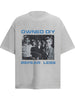 Make a bold statement with this basic-fit graphic tee, featuring a distressed black-and-white photo of six children in vintage attire, framed by stylized blue and white text. The phrases "OWNED DIY" and "BEFEAR LESS" (a raw twist on “Be Fearless”) add a rebellious, DIY aesthetic that blends nostalgia with streetwear grit. The washed black backdrop enhances the retro vibe, making this tee a standout for those who embrace bold individuality.