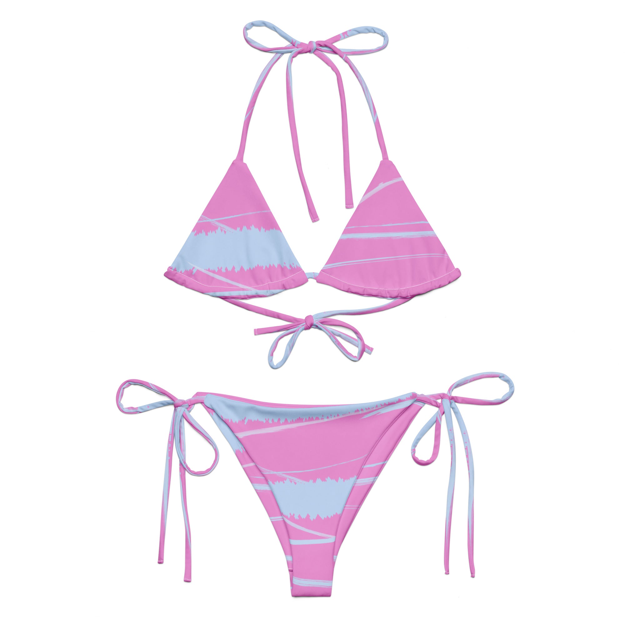 Make a bold statement with our Pink Stripes Pattern Recycled String Bikini. This all-over print bikini is a perfect blend of style and sustainability, making it a must-have for the eco-conscious beachgoer.