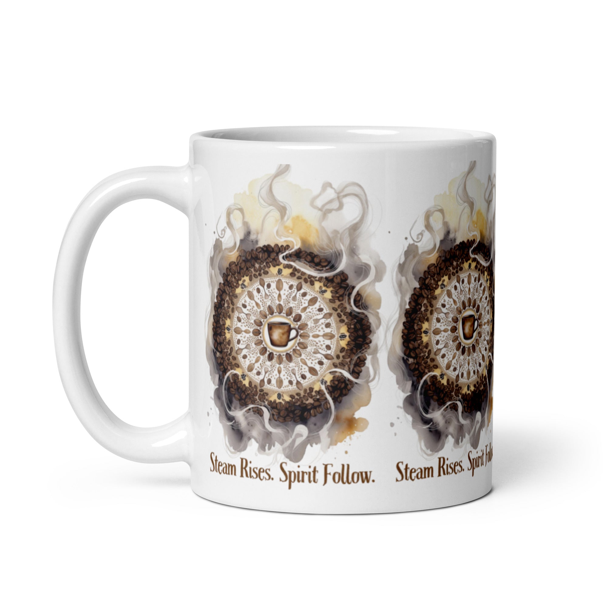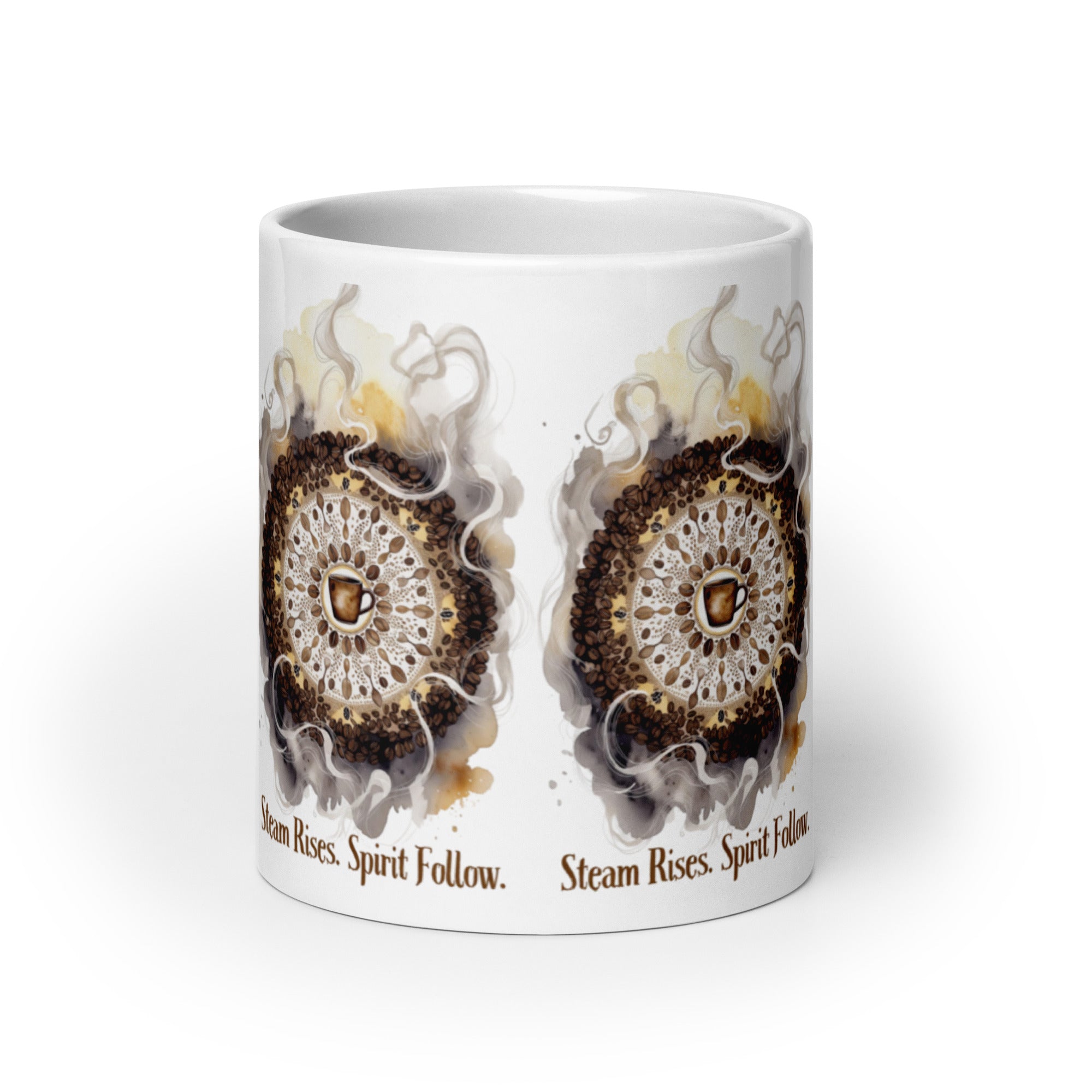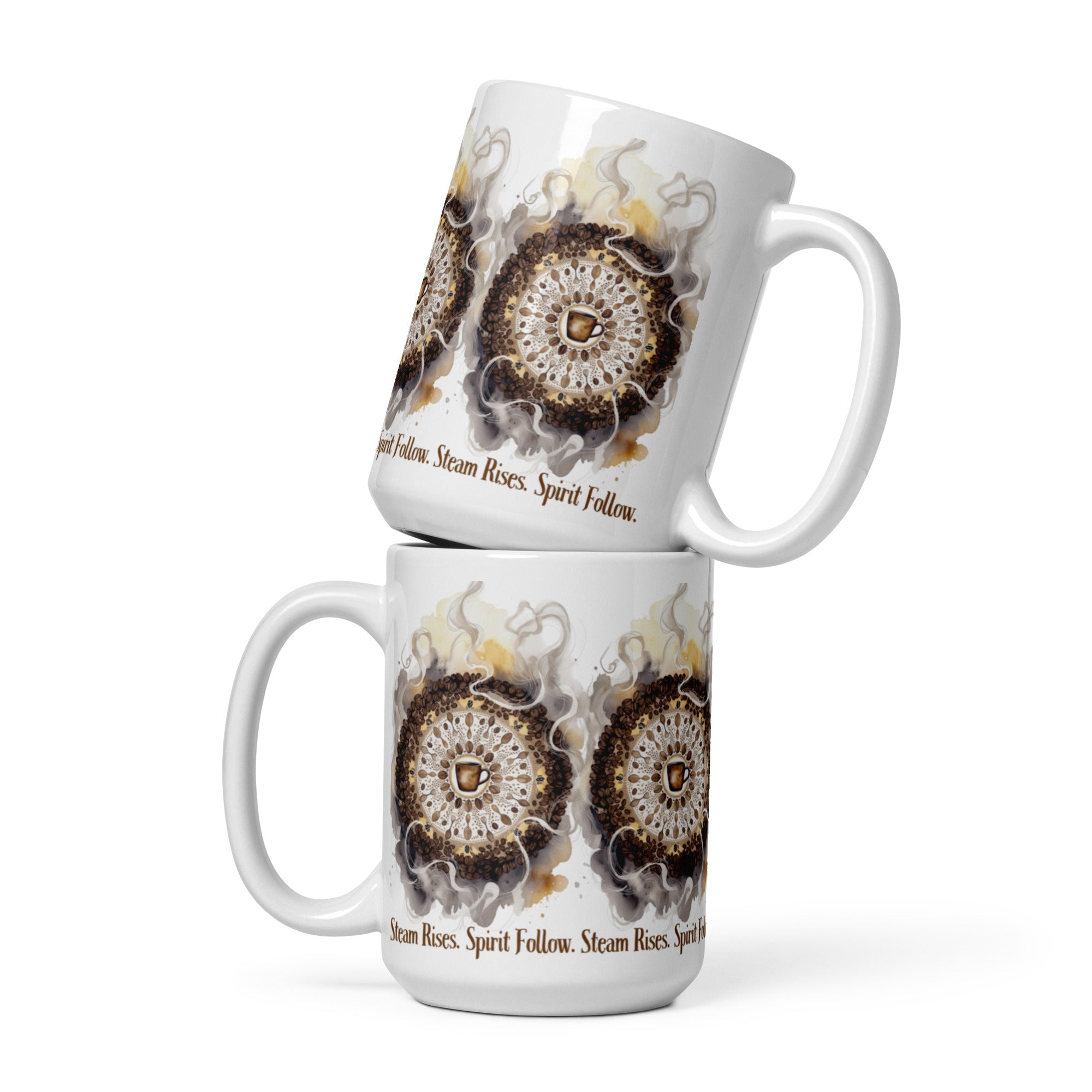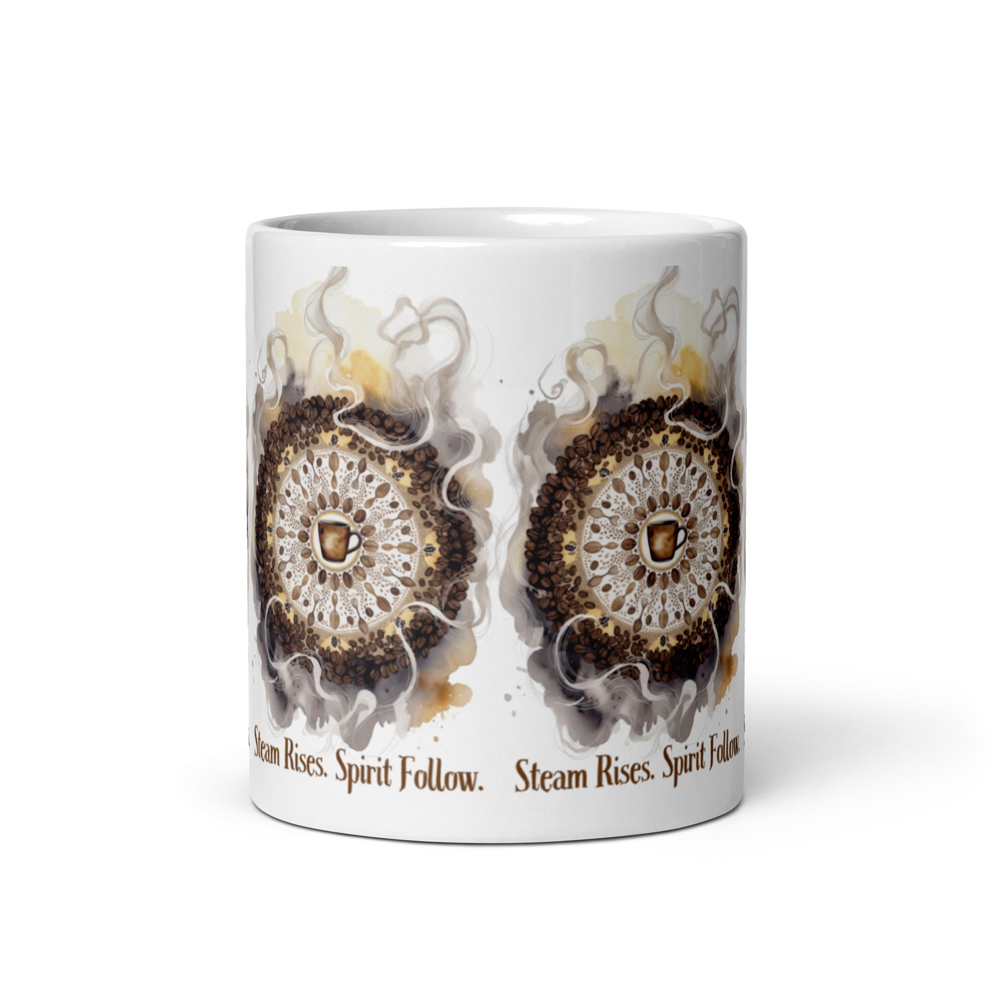Let your morning brew become a meditation. The Steam Rises Ceramic Mug features a circular coffee-stain motif with a central cup and swirling steam patterns in rich browns and beiges. The repeated phrase “Steam Rises. Spirit Follow.” wraps the design in poetic rhythm, inviting you to pause, sip, and align.