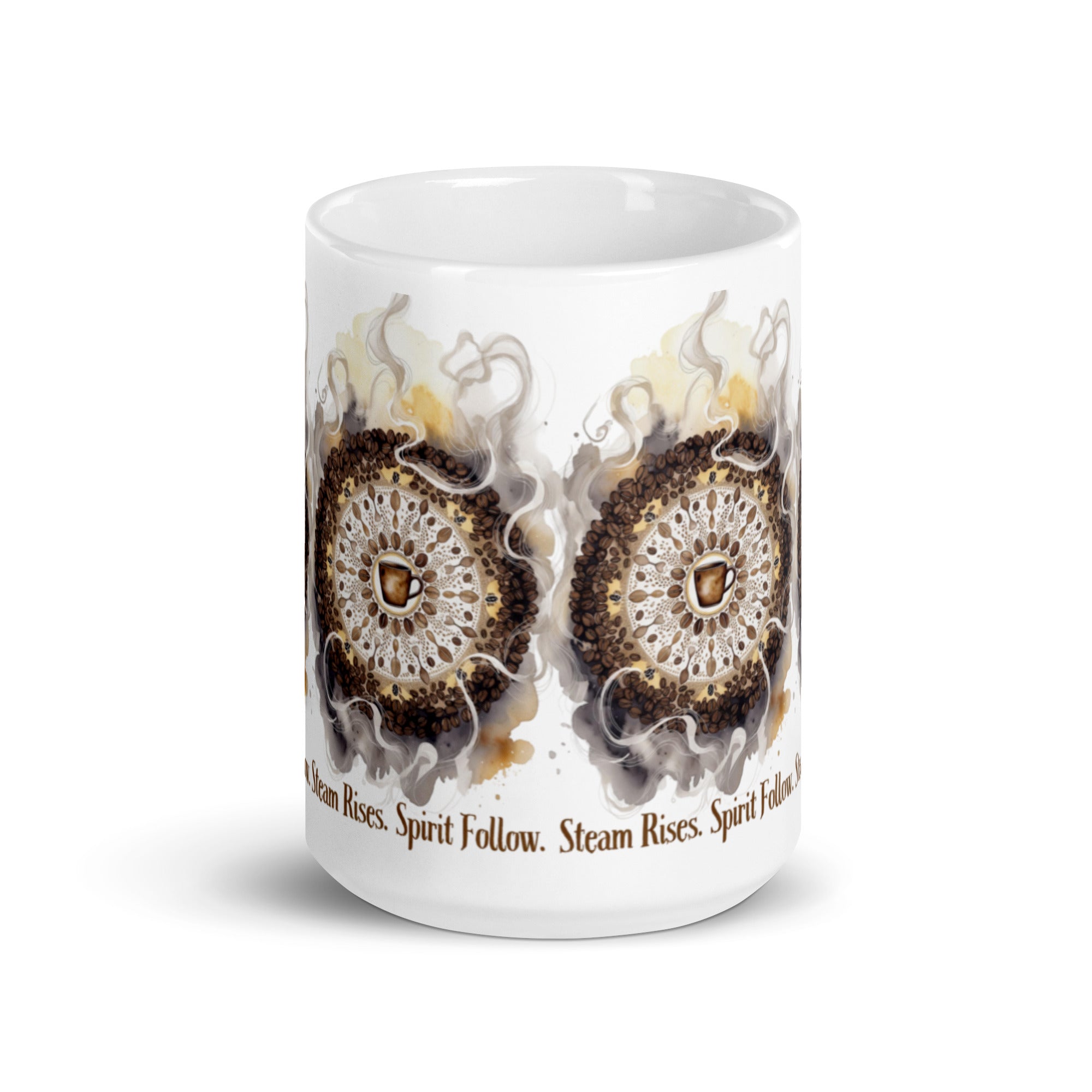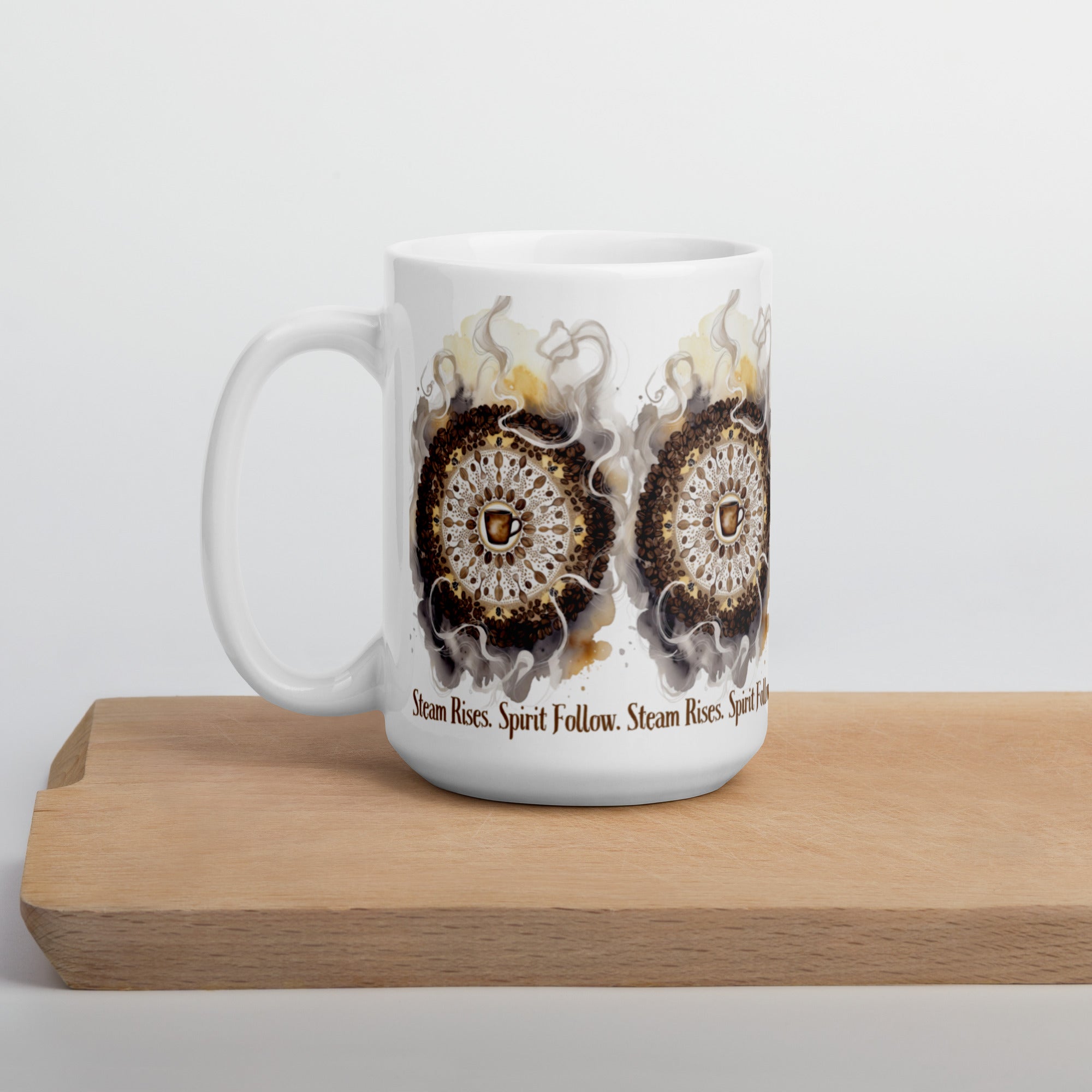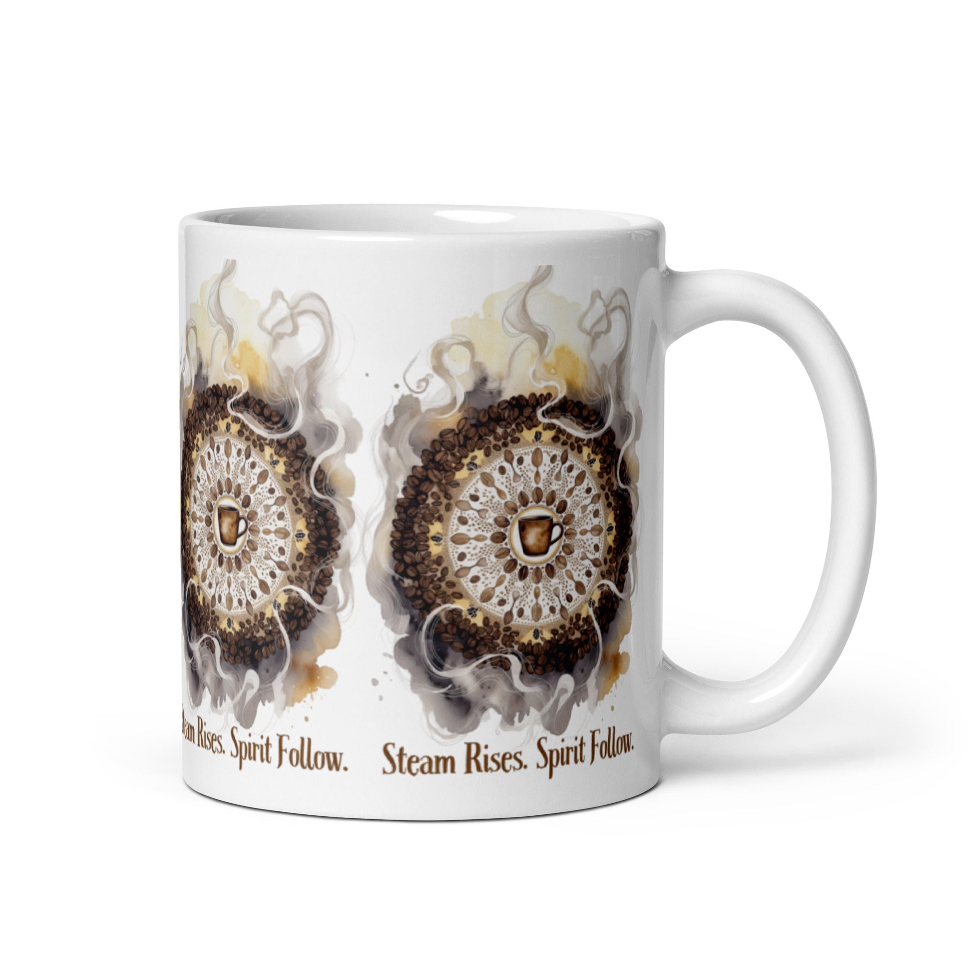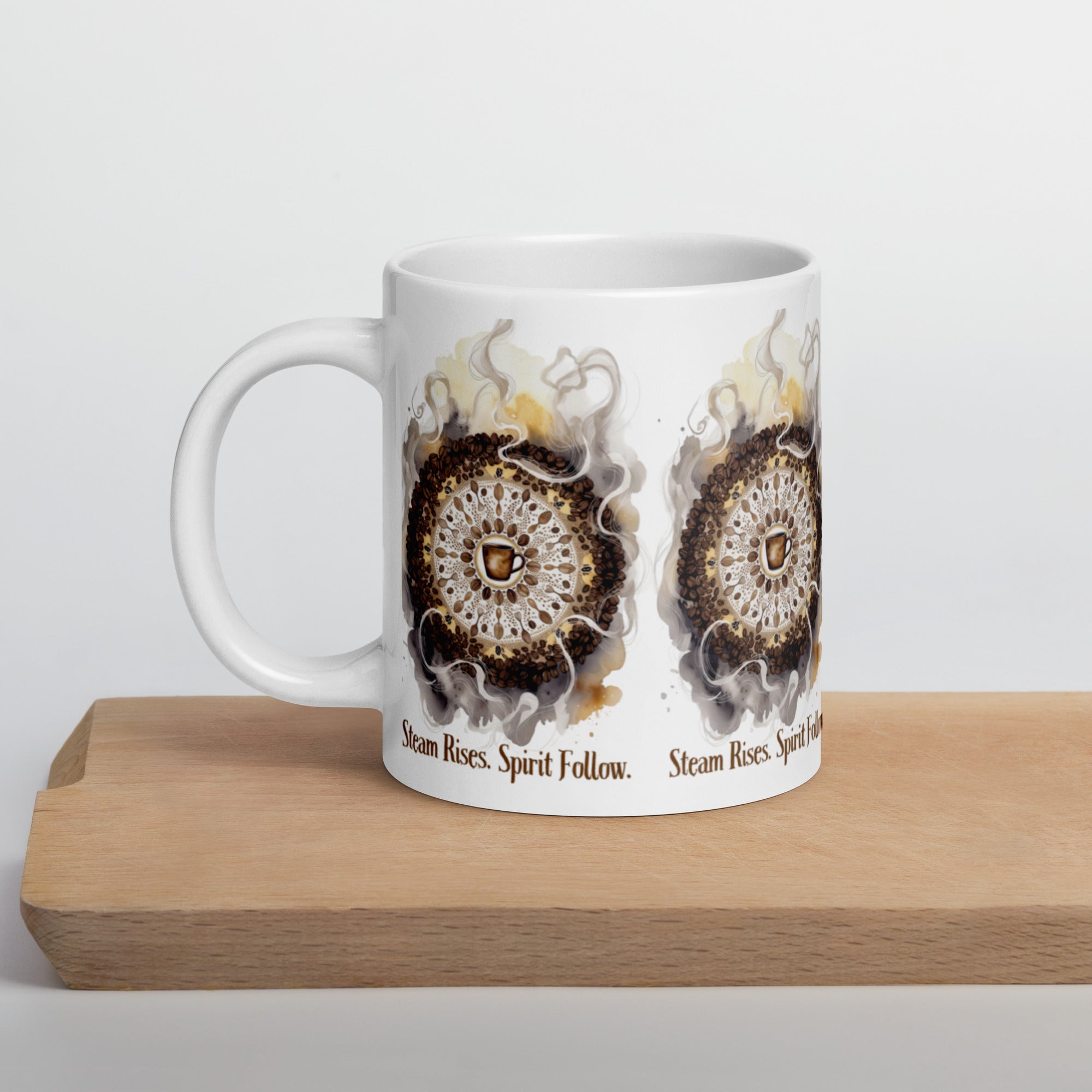 Let your morning brew become a meditation. The Steam Rises Ceramic Mug features a circular coffee-stain motif with a central cup and swirling steam patterns in rich browns and beiges. The repeated phrase “Steam Rises. Spirit Follow.” wraps the design in poetic rhythm, inviting you to pause, sip, and align.