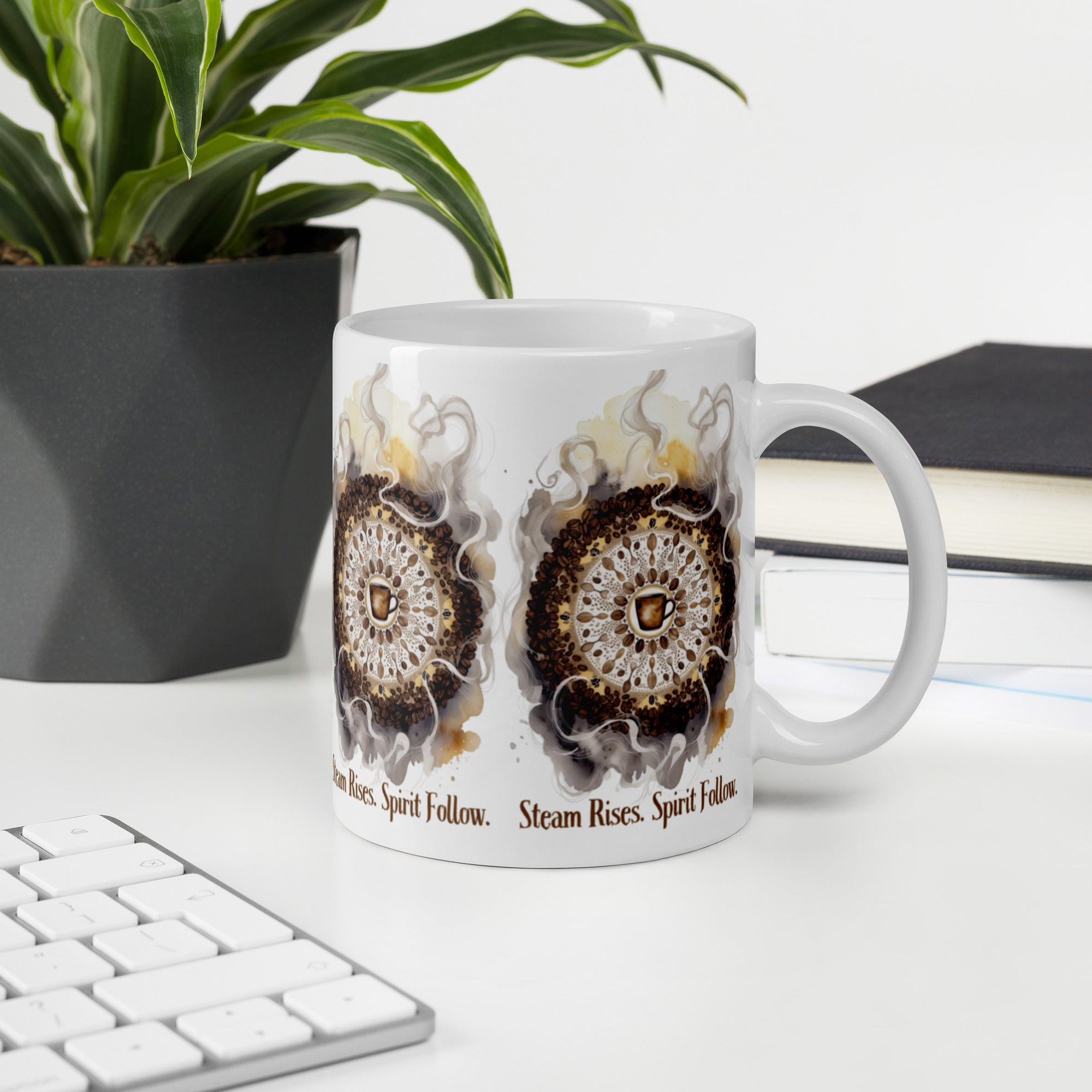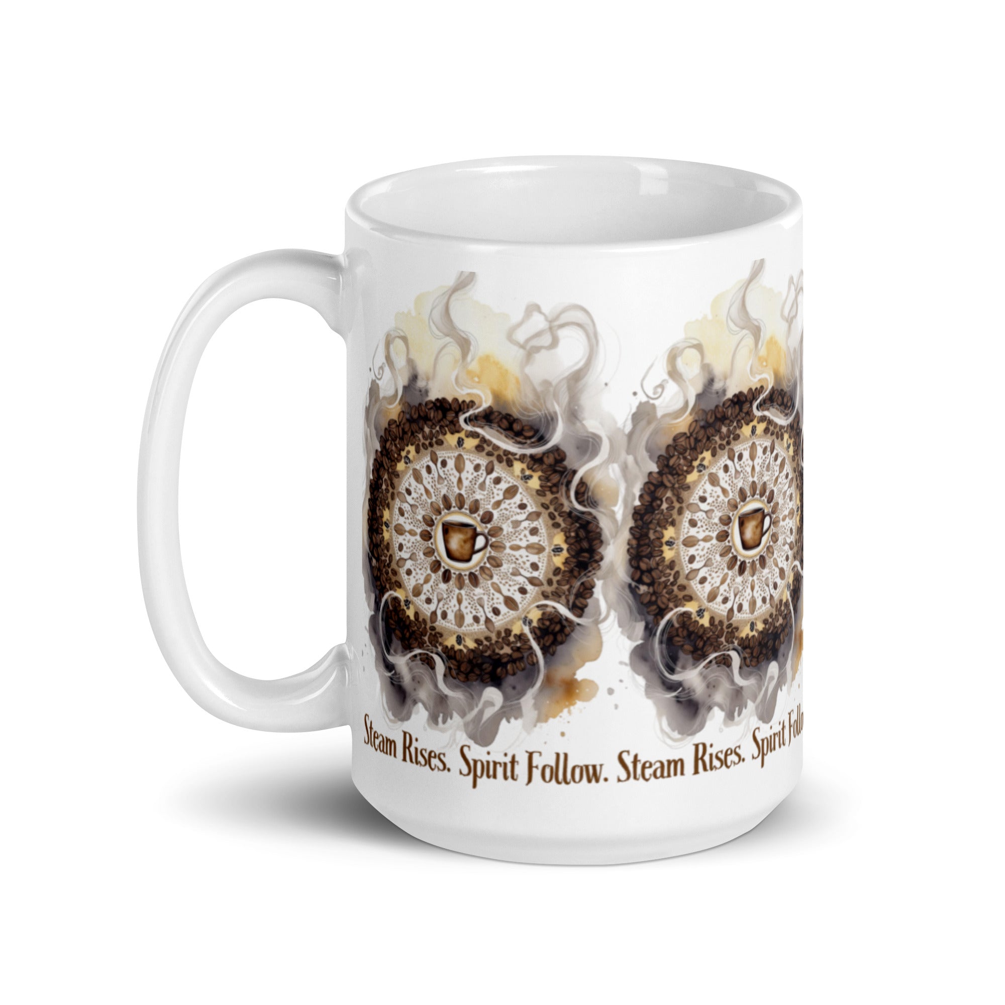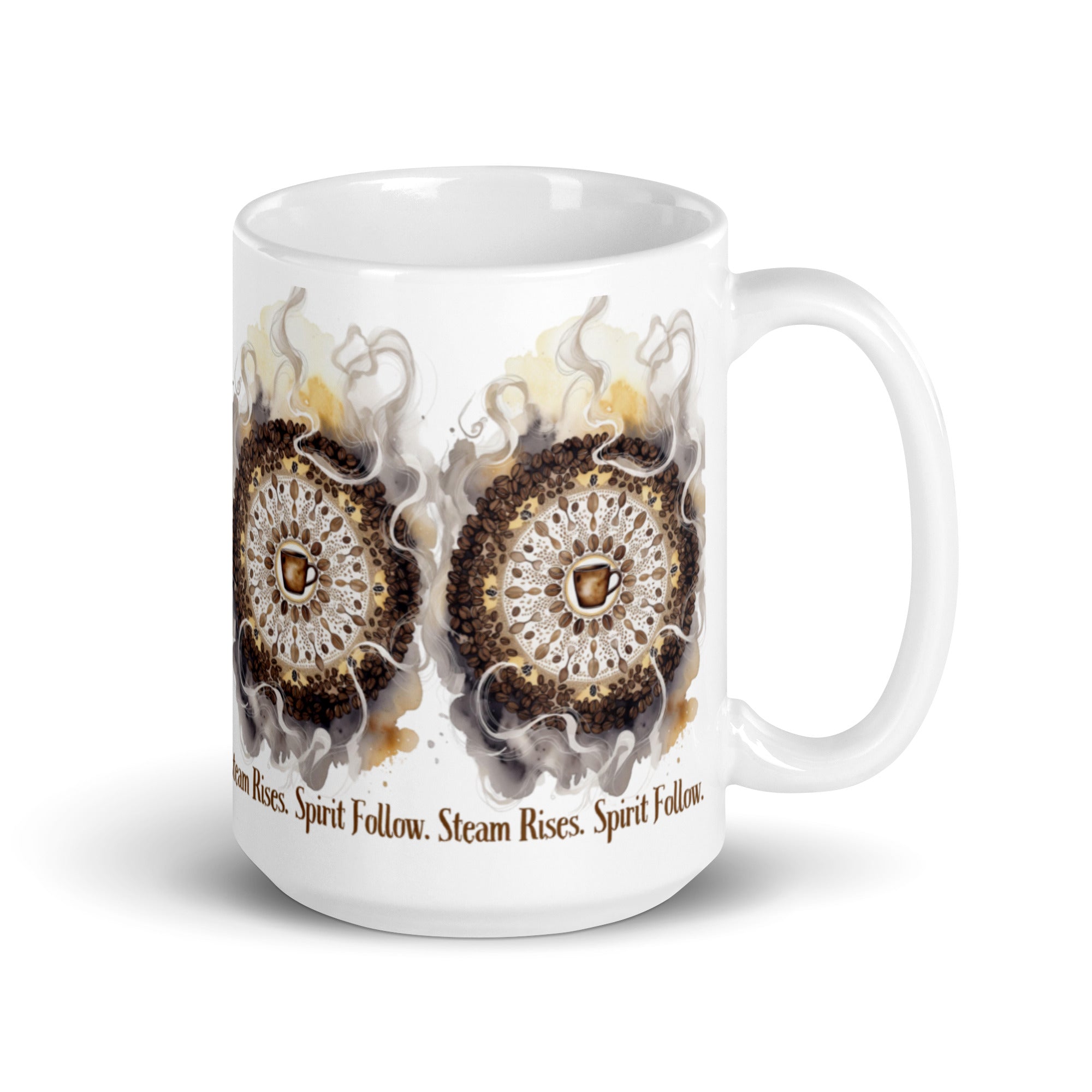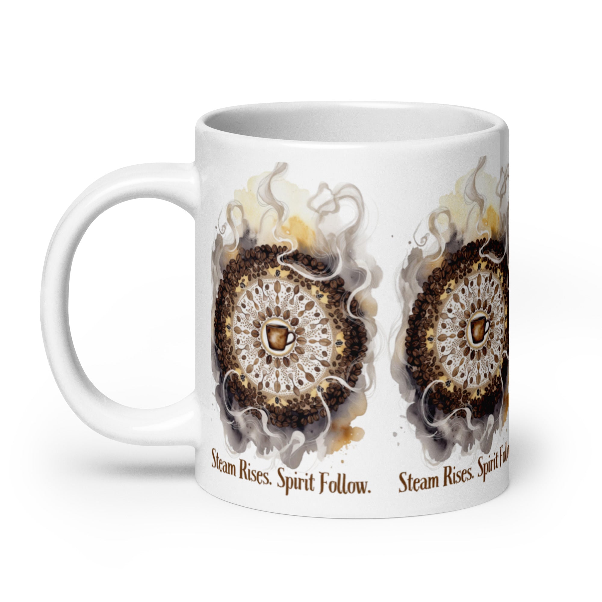 Let your morning brew become a meditation. The Steam Rises Ceramic Mug features a circular coffee-stain motif with a central cup and swirling steam patterns in rich browns and beiges. The repeated phrase “Steam Rises. Spirit Follow.” wraps the design in poetic rhythm, inviting you to pause, sip, and align.