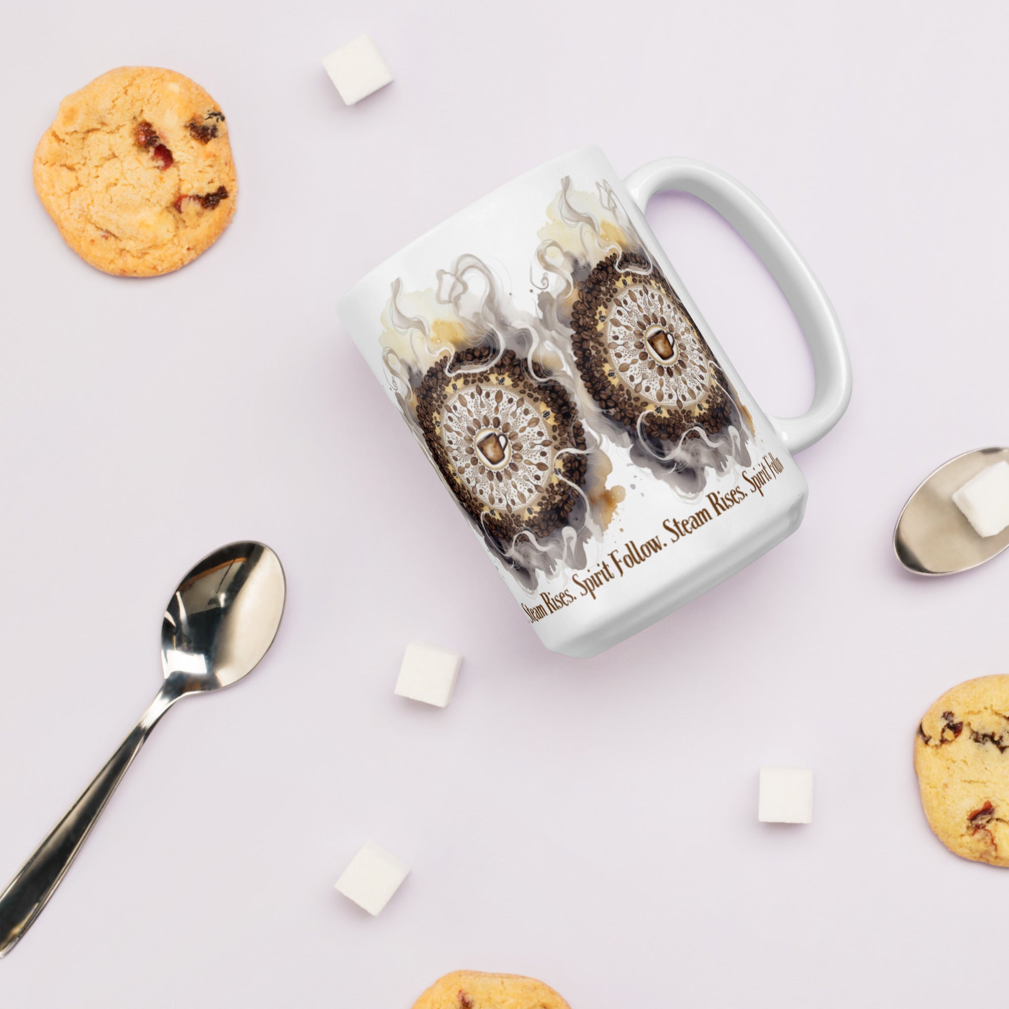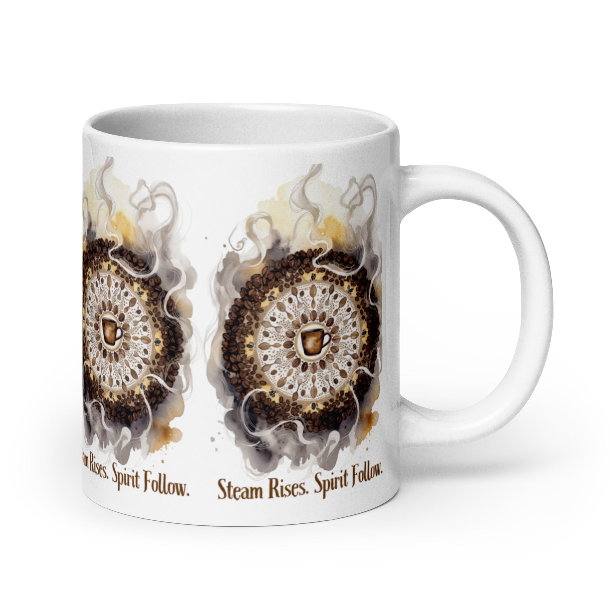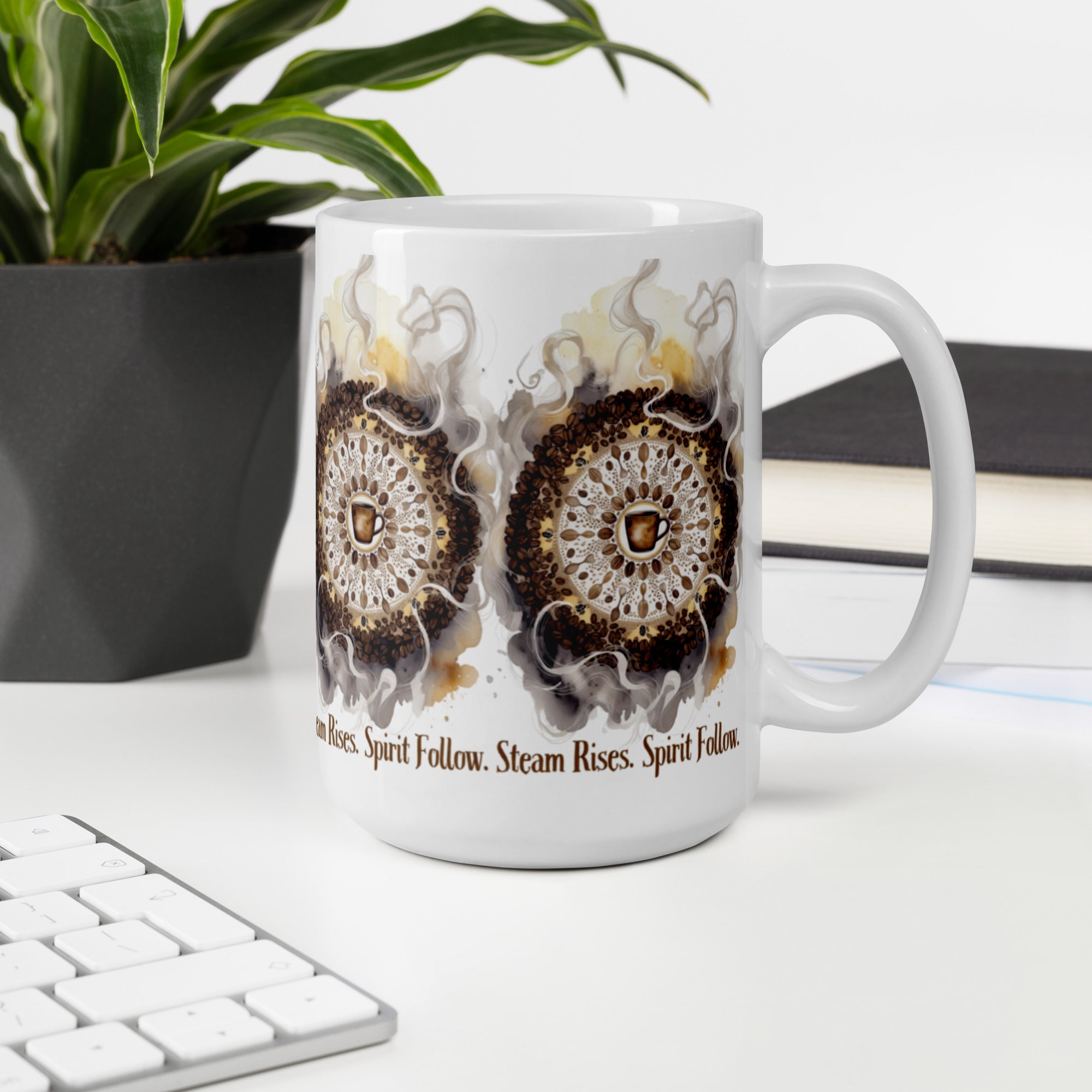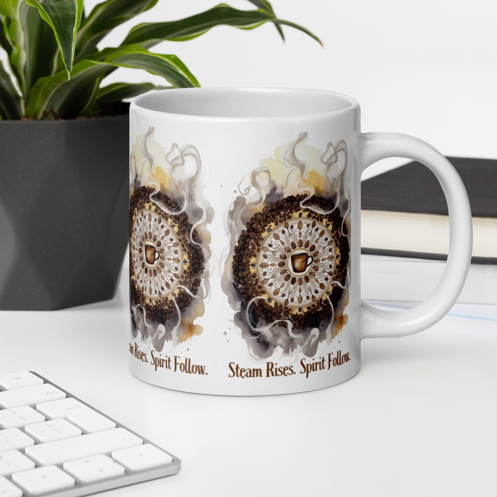 Let your morning brew become a meditation. The Steam Rises Ceramic Mug features a circular coffee-stain motif with a central cup and swirling steam patterns in rich browns and beiges. The repeated phrase “Steam Rises. Spirit Follow.” wraps the design in poetic rhythm, inviting you to pause, sip, and align.