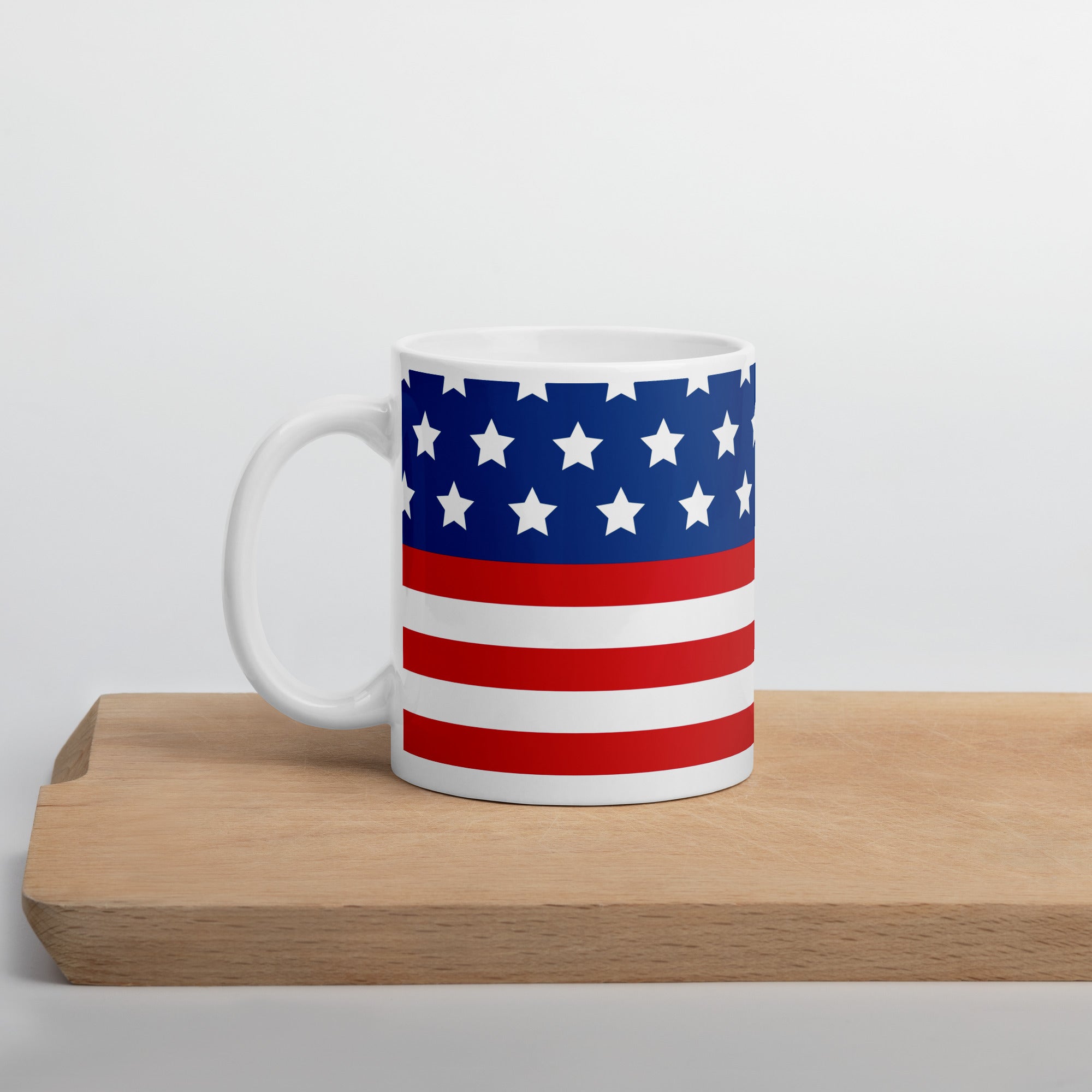 The exterior of the mug is adorned with the iconic star and stripe pattern, creating a bold and vibrant look that stands out. Whether you’re enjoying your morning coffee or sipping on a hot chocolate by the campfire, this mug brings a touch of Americana to your beverage moments.